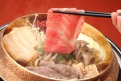 近江肉の廣田では滋賀食肉市場から直接一頭買いしています。熟練の職人の目利きにより近江牛の中でも特に質の高いものを仕入れており、常に最高の美味しさを追及しております。最高の格付けであるA5ランクの霜降り肉肩ロースと上質なモモ肉のすきやき用となっております。味わい深い肩ロースとあっさりだけど柔らかいモモの二つの味わいを堪能できます。控えめな味付けで近江牛肉本来の旨味をお楽しみください。