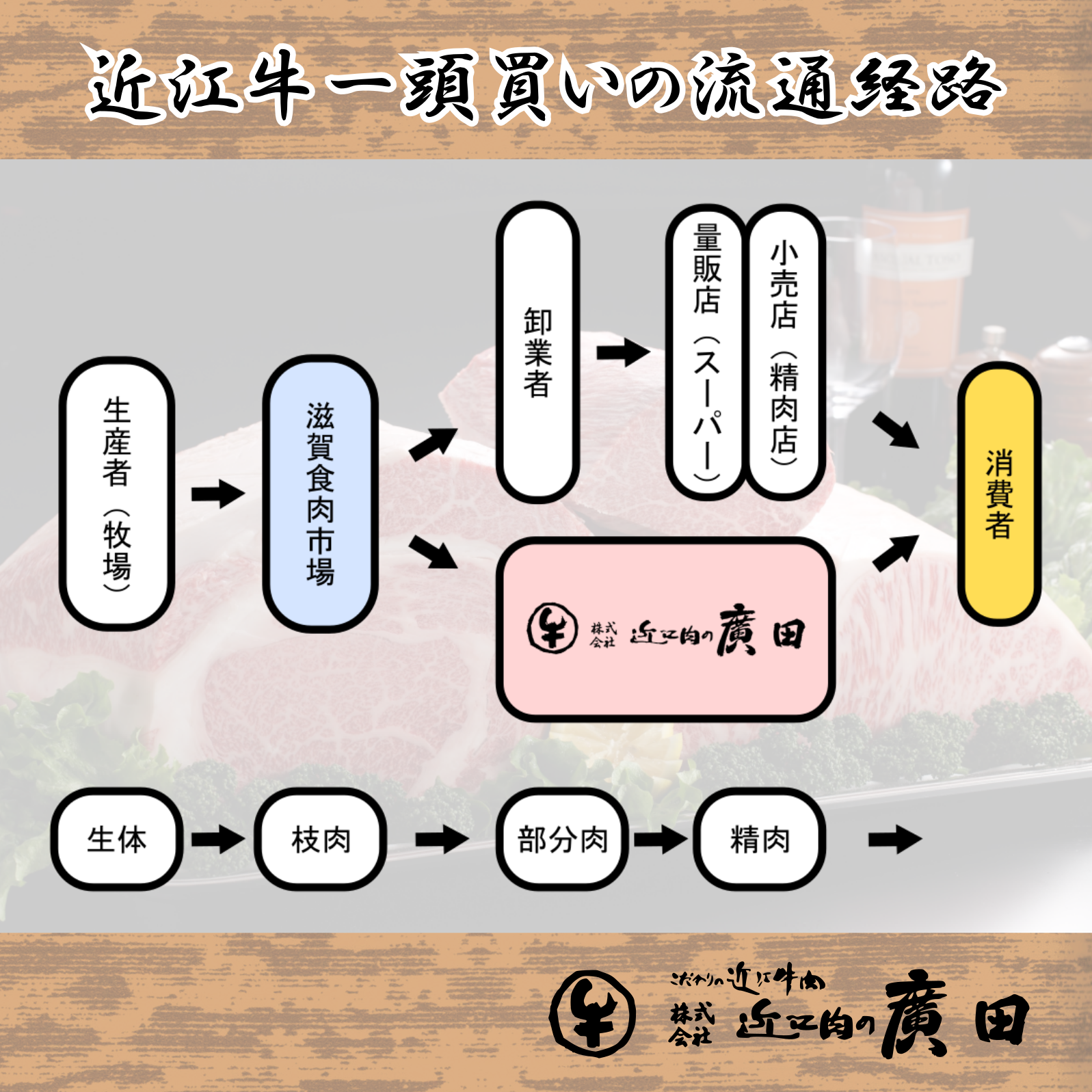 近江肉の廣田では滋賀食肉市場から直接一頭買いしています。熟練の職人の目利きにより近江牛の中でも特に質の高いものを仕入れており、常に最高の美味しさを追及しております。